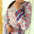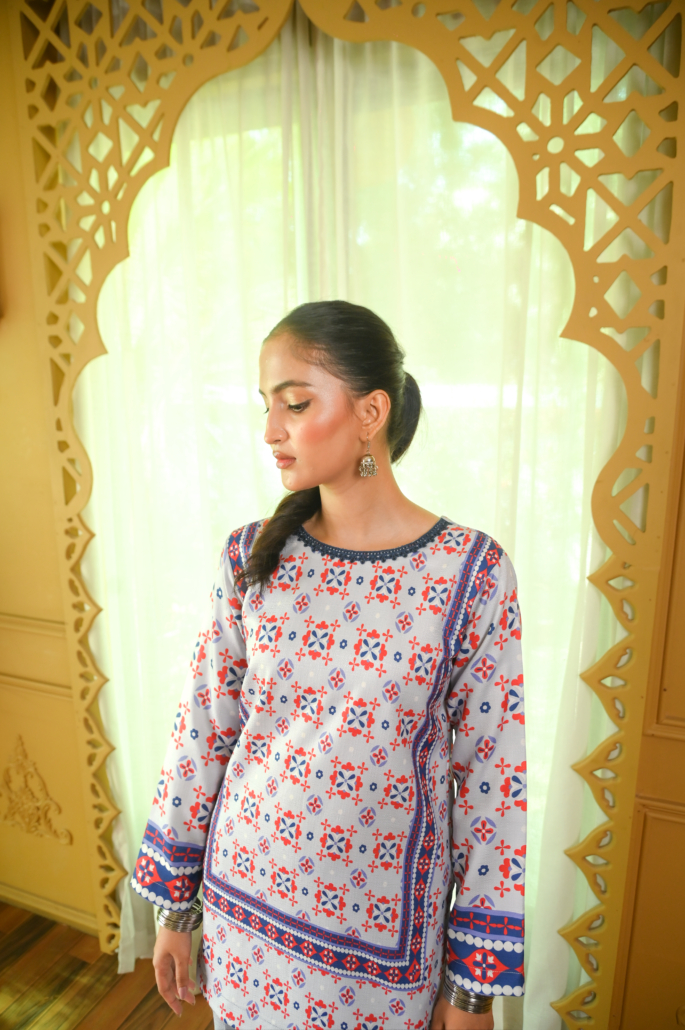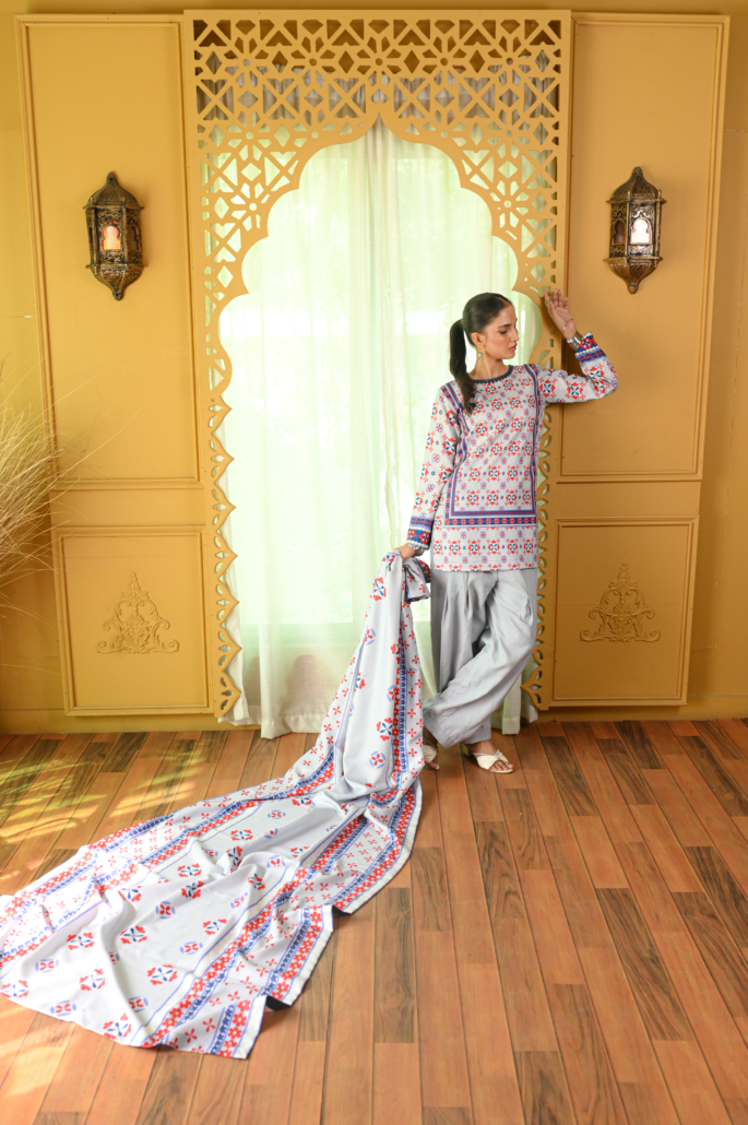 Wafa is a refined 3-piece ensemble that carries the same signature blend of vibrant prints and soft pastel hues, elevated with added layers and detail. The straight-cut kurti offers a sleek, modern silhouette, paired with pleated balloon pants that bring volume, movement, and a contemporary edge. Completing the look is a beautifully bordered dupatta, finished with silk fabric to add structure, elegance, and a polished fall. Wafa is designed for those who love expressive design balanced with graceful sophistication.